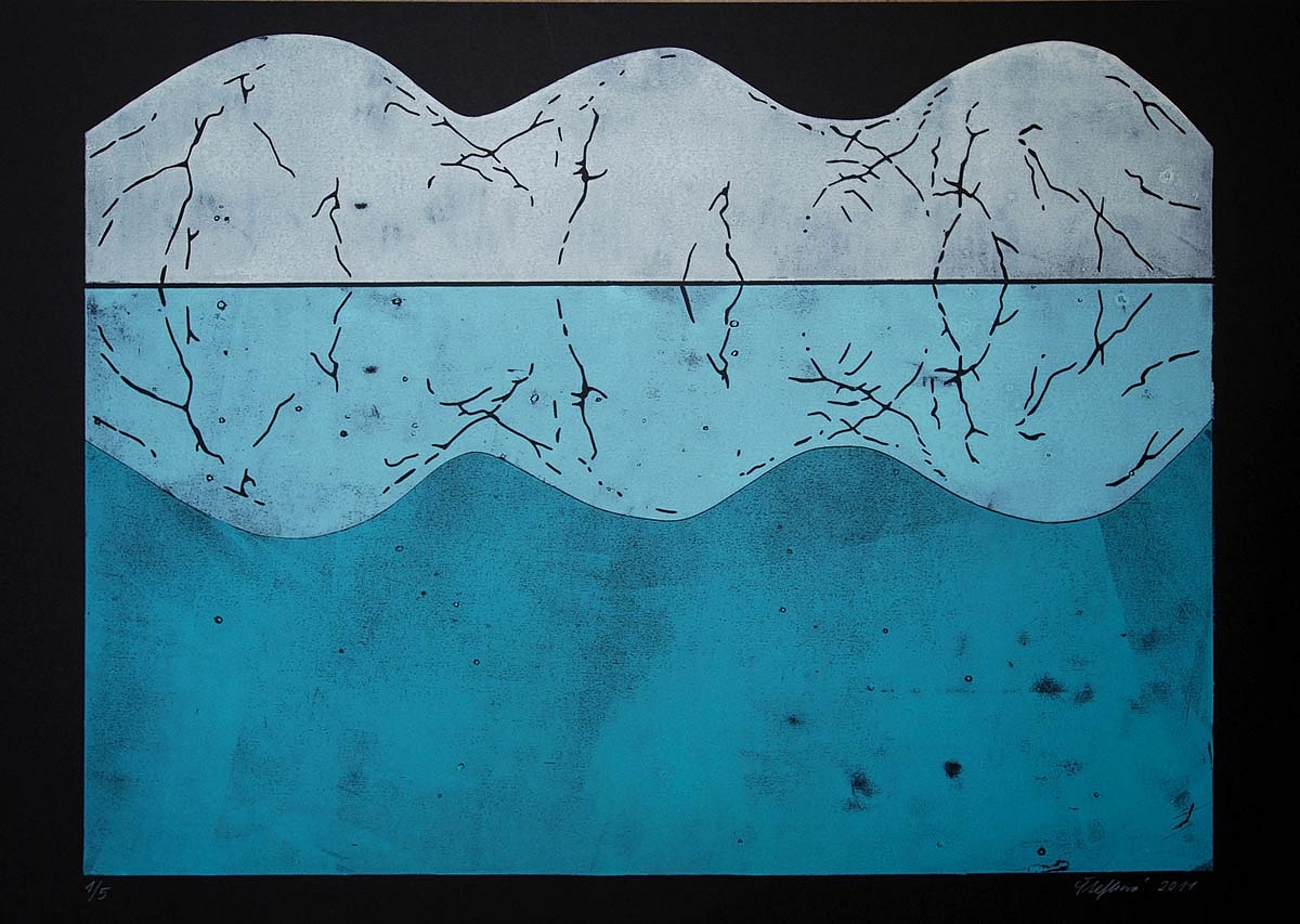 Grafika z cyklu Pískovny, který vznikl jako diplomová práce. Motivem jsou jihočeské pískovny u Suchdola nad Lužnicí.