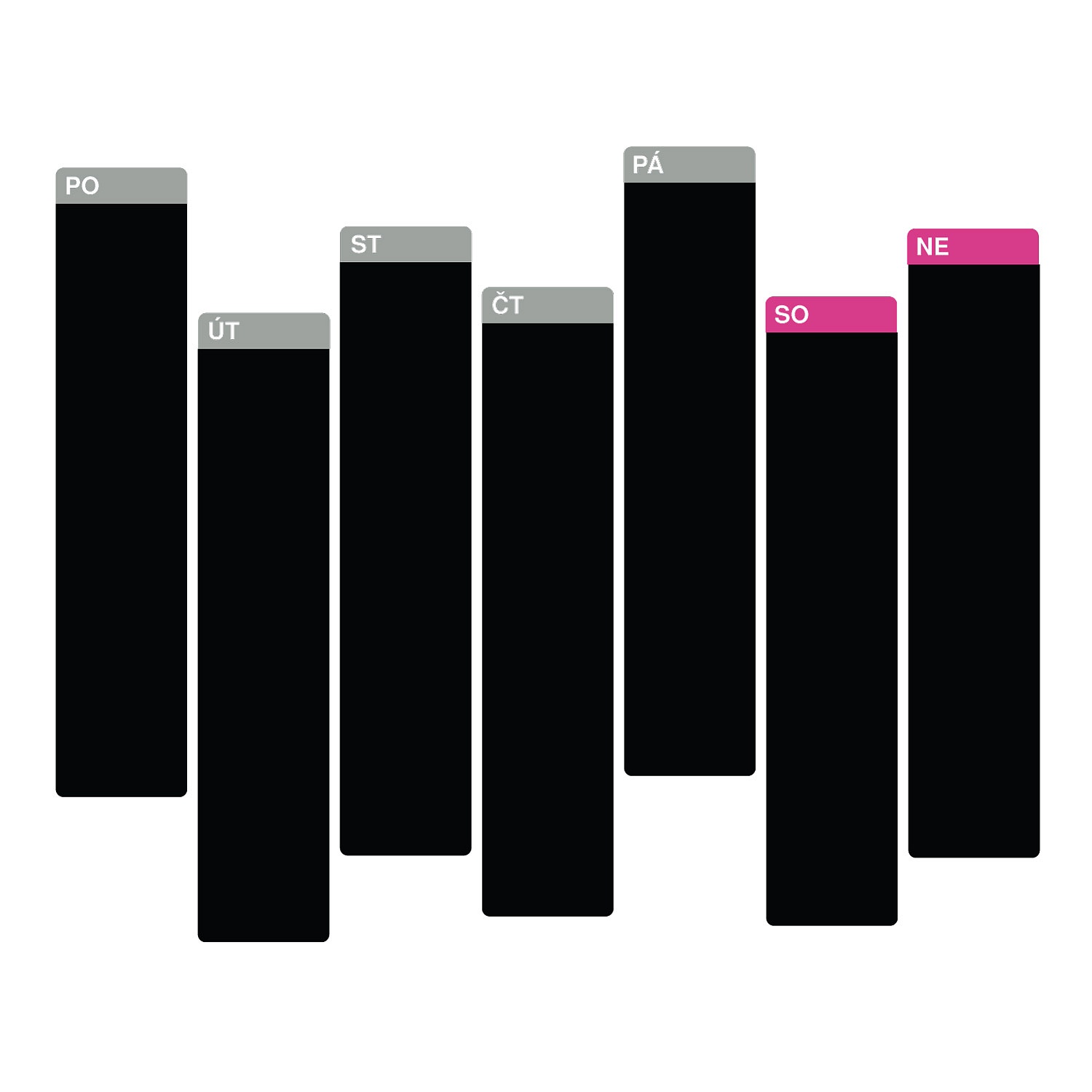 Velikost: 7x tabule o rozměru 22x100 a 7x samolepka s označením dnů 22x6. Celkový rozměr při rozložení dle obrázku č.1 je 166x106.