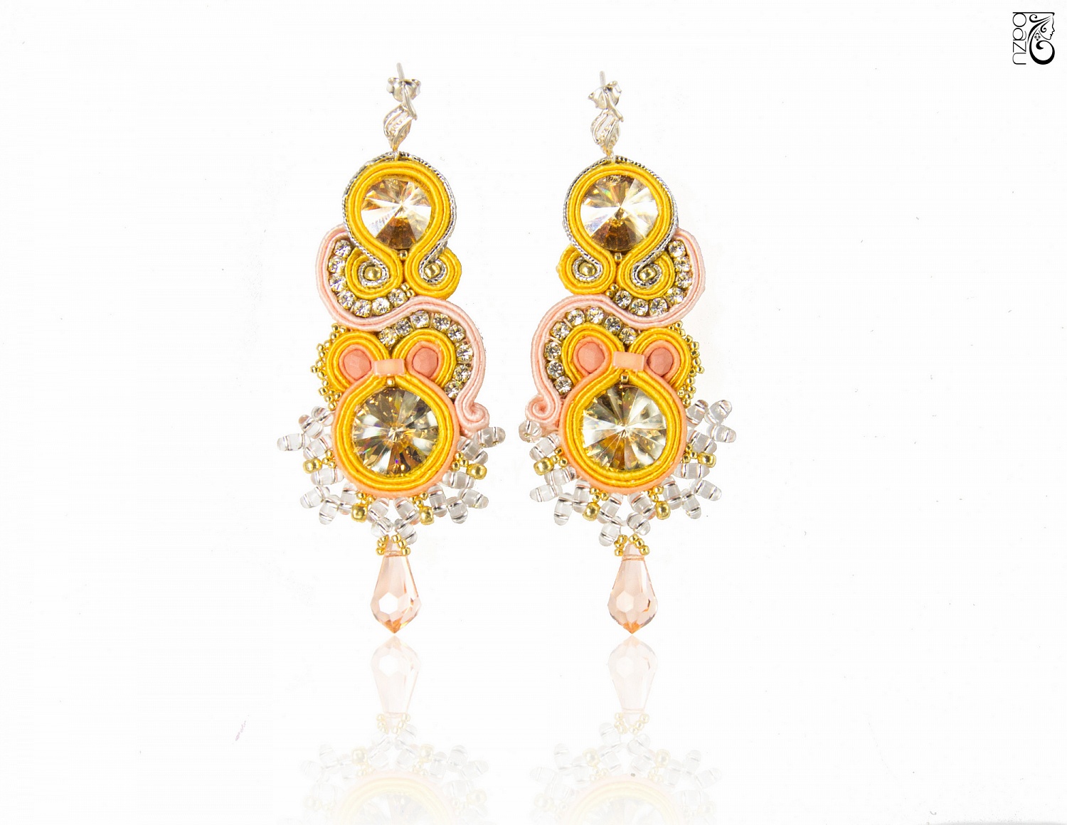 Dlhé elegantné náušnice z kolekcie Vesna a Večernica v kombinácii farieb žltá-oranžová-lososovoružová- zlatá.