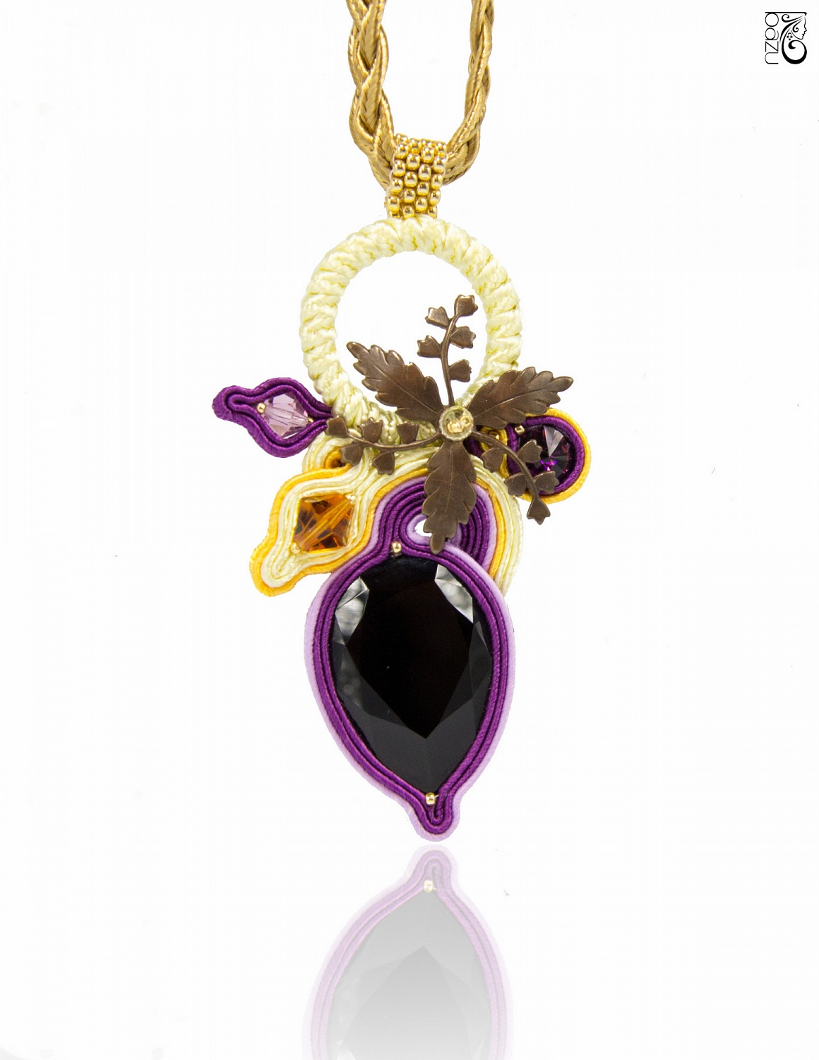 Elegantný prívesok zavesený na ručne splietanej šujtášovej retiazke z kolekcie Vesna a Večernica v kombinácii farieb fialová, žltá a čierna.