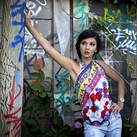 Kolekce značky Gypsy MaMa. Saténový šátek s grafickým zpracováním romských kol, uprostřed květinová koláž.