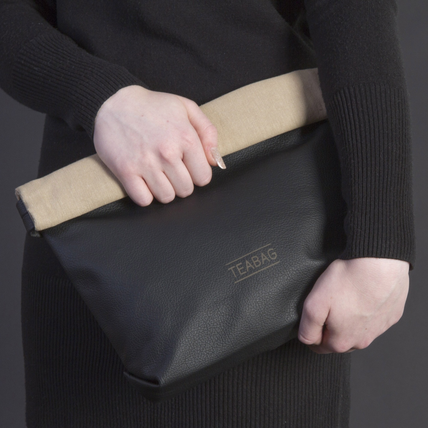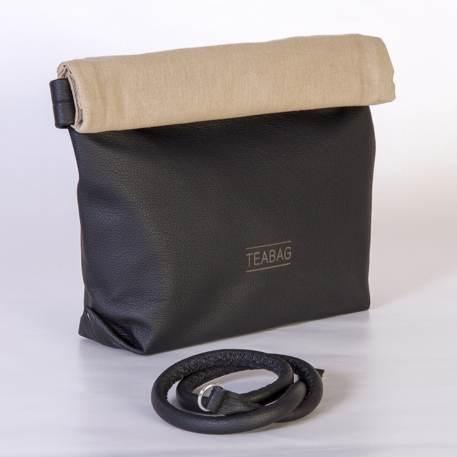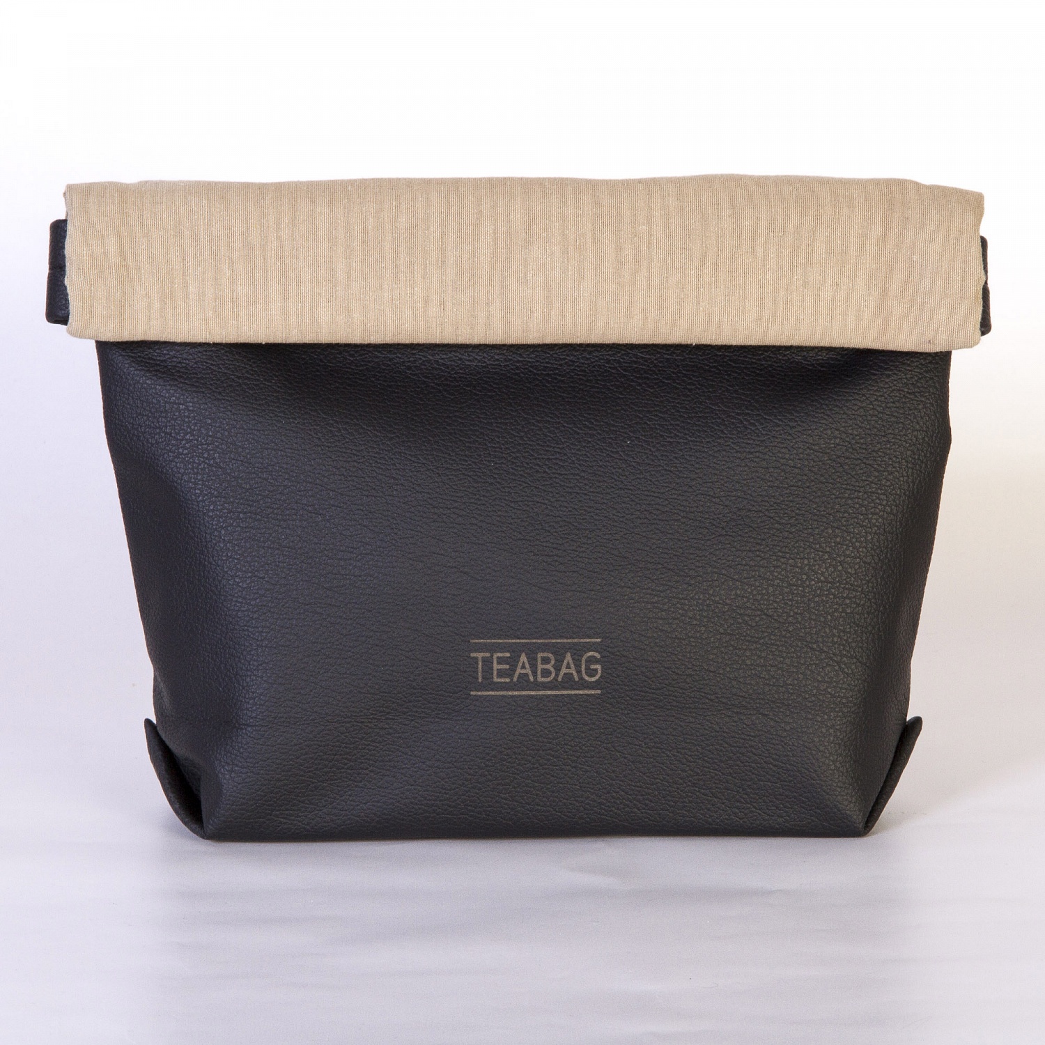 Kožený TEABAG v kombinaci s pevnou bavlněnou tkaninou, která je využita na horní rolovací část a vnitní podšití tašky. Uvnitř kapsičky na drobnosti, odepínací pásek.